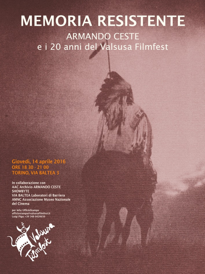 Il 14 aprile a Torino in Via Baltea 3 / Laboratori di Barriera si svolgerà un evento speciale intitolato “Memoria Resistente, ARMANDO CESTE e i 20 anni del Valsusa Filmfest” con presentazione del sito web e dell'archivio dedicato alla memoria di uno dei pionieri del cinema sociale italiano che fu anche tra i fondatori del Valsusa Filmfest.